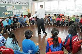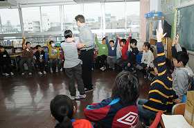 今日は丸い隊形になってゲームをやります。まず、英語でのルールの説明を聞いています。