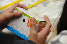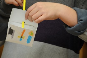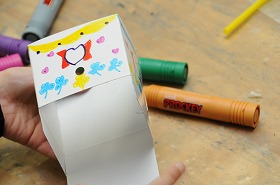 「フーッととび出るびっくり箱」をテーマに、かさぶくろを使ってびっくり箱を作ります。絵を書き終わった箱を組み立てています。