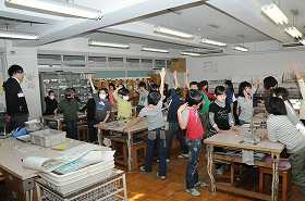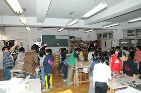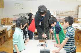 金属のあたたまり方を調べる実験をします。衣服に火がつかないように、安全の点検をしています。