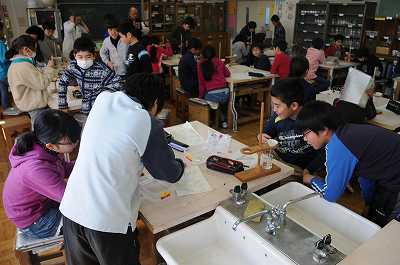 水溶液をろ紙でこして、結晶を作っていく実験をしています。