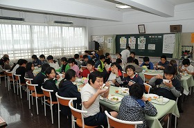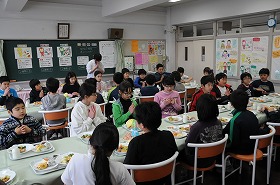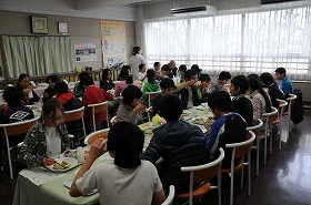 先日学んだバランスのよい食事を実際の給食で確認するために、バイキング給食を行っています。自分で選んだ献立を食べています。