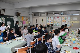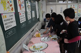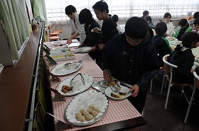 先日学んだバランスのよい食事を実際の給食で確認するために、バイキング給食を行っています。学んだことを生かして献立を選んでいます。