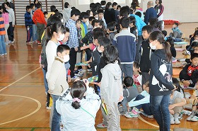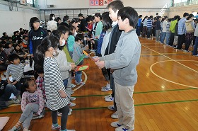 なの花タイムに在校生みんなで書いたメッセージカードを6年生に渡すのは2年生の仕事です。