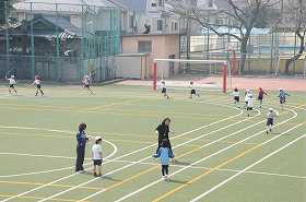 なわとびの練習として、トラックをかけ足とびで回っています。健康トレーナーが授業支援をしています。