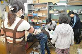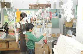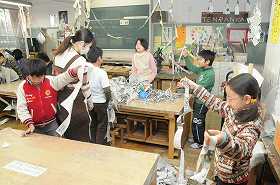 「長い紙を作って」をテーマに、新聞紙を細長く切って、室内でできることを試しています。わかたけ2組の3年生もいっしょに活動しています。