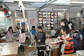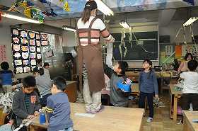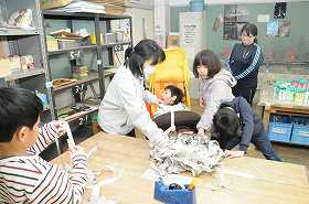 「長い紙を作って」をテーマに、新聞紙を細長く切って、室内でできることを試しています。わかたけ2組の3年生もいっしょに活動しています。