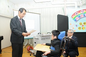 はじめのことばのあとで、わかたけ学級版の卒業証書を渡しています。
