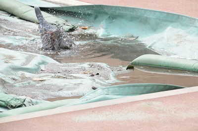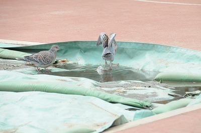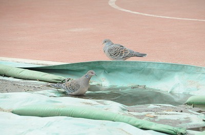 暖かい日差しに誘われたのか、砂場のシートにたまった水で鳩が水浴びをしています。