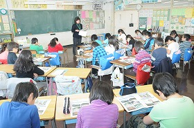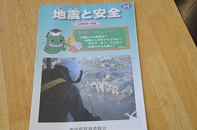 「地震と安全」の資料を見て、自分の身を守るためにはどうしたらよいかを考えています。