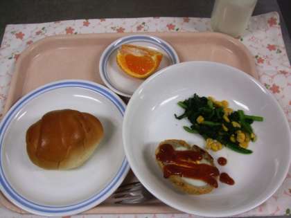 今日の給食は、バターロールパン・スコッチエッグ・青菜とコーンのソテー・くだもの(デコポン)・牛乳でした。