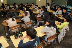 新しいクラスで担任の先生と学級活動を行っています。