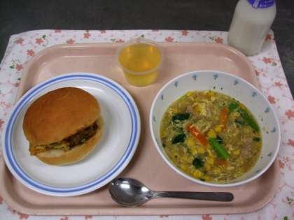 今日の給食は、フィッシュバーガー・華風コーンスープ・アップルゼリー・牛乳でした。