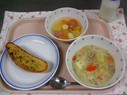 今日の給食は、ガーリックトースト・あすかチャウダー・紅白白玉ポンチ・牛乳でした。