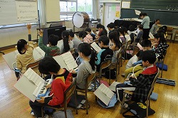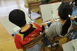 楽譜を読みながらけん盤ハーモニカを使い演奏の練習をしています。