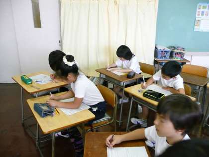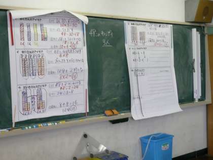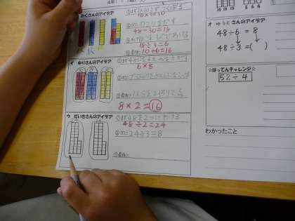 わり算の計算の仕方について、レポートにまとめています。色わけをして、分かりやすくなってきました。