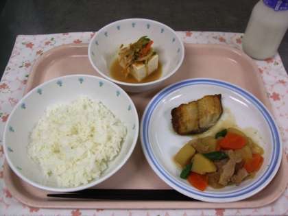 今日の給食は、ごはん・ほっけの塩焼き・肉じゃが・豆腐のゴマだれサラダ・牛乳でした。