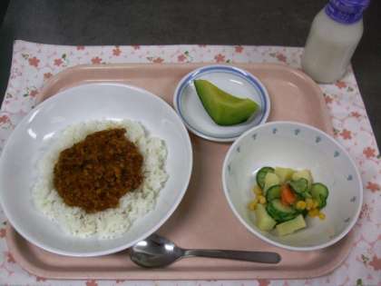 今日の給食は、ドライカレー・ポテトのフレンチサラダ・果物(メロン)・牛乳でした。