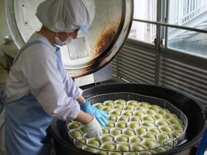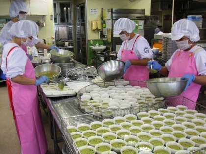 米粉の蒸しパンは新メニューです。小麦粉と違って米粉はもちもちとした食感に仕上がります。今日は5月の新茶の季節に合わせて抹茶を加えて作りました。中には甘く煮た小豆も入れて、おいしい和風蒸しパンとなりました。子どもたちは「ほんとにもちもちしてる〜♪」「と食感を楽しんでいました。