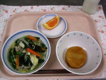 今日の給食は、塩ラーメン・じゃがいももち・くだもの(清見)・牛乳でした。