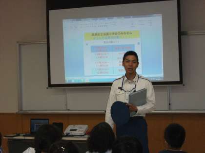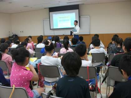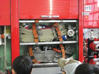 3、4時間目に消防署見学へ行きました。消防署の仕事について説明を聞いています