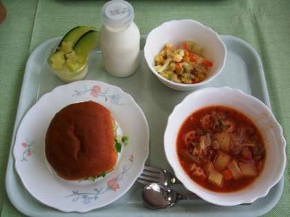 今日の給食は、タンドリーチキンサンド・ミネストローネ・コールスローサラダ・牛乳でした。