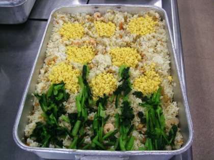 菜の花ずしはたくさんの具とすしめしを混ぜ合わせて作ります。そしてお祝いメニューと言うことで、配缶した表面には卵と小松菜を使って油面小学校の校章にもなっている菜の花を飾りました。(見えるかな?)