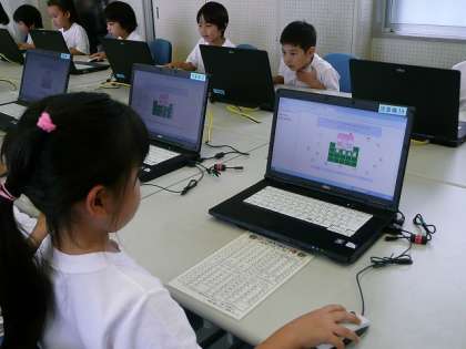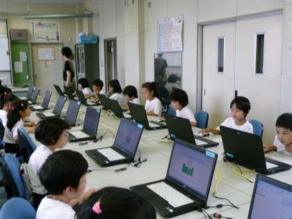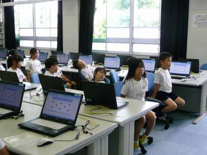初めてパソコン室で学習しました。基本的な操作の仕方を学習しています。みんなパソコンの画面に集中しています。
