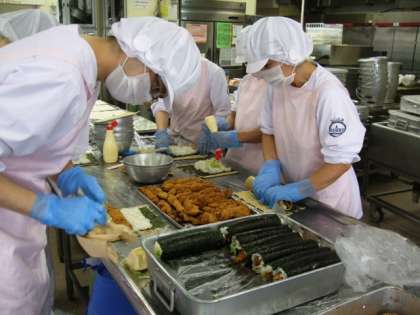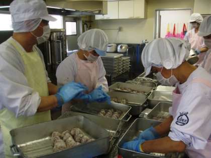 いよいよ明日は運動会本番です。給食室では油面小学校のみなさんを応援して、カツ(勝)巻きずしを作りました。作った本数は全部で120本!朝からカツをまっすぐになるように丁寧に揚げ、酢飯を作り、のりに広げて巻き、巻き終わったものをきれいに切り分けて・・・さらにゆかりおにぎりも作ってと、給食室は大忙しでした。