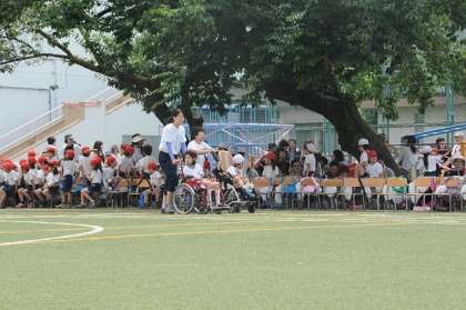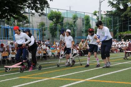 わかたけ学級の走競技です。一人一人が、一生懸命に競技にのぞんでいます。子どもたちの応援席の前なので、それぞれのチームが応援してくれています。
