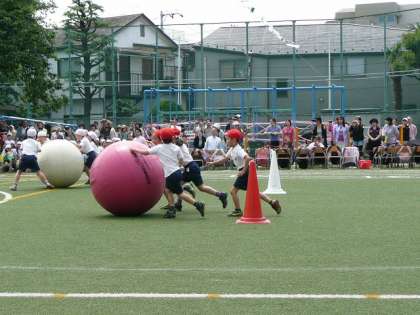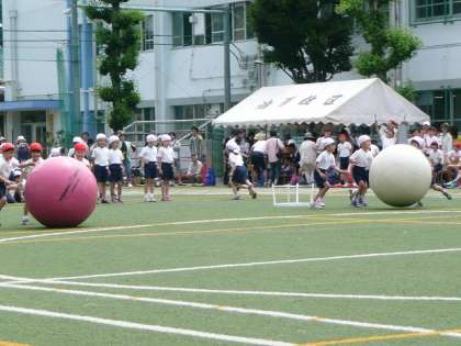 団体競技「みんなでワッショイ!」です。紅白を大玉を4人で協力して、リレーしていきます。