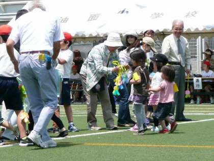 うれしそうにメダルをもらったちびっこは、おうちの方のところへ走っていきました。この折り紙メダルは、4年生のみんなが一生懸命に作ってくれました。