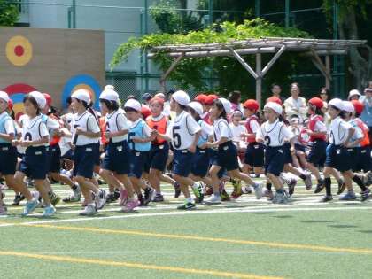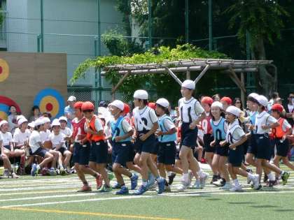 午前の部の最後は、1〜3年生の代表児童による紅白対抗リレーです。全員でそろって入場です。