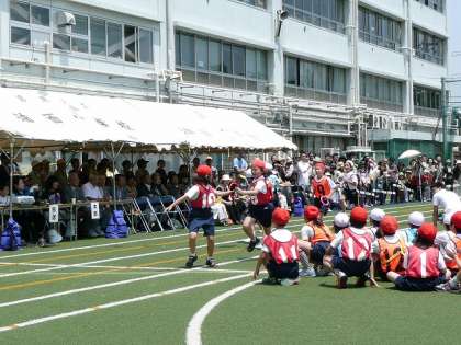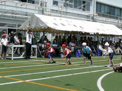 1、2年生は半周、3年生は1周を走ります。低学年はリングバトンを渡してつないでいきます。