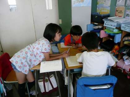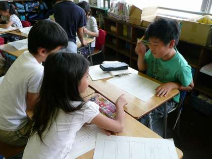各班でテーマを選択し、アンケート調査を実施します。どんなアンケート項目を作るか、グループで話し合っています。「こっちのほうがいいよ」「あれも聞いてみたい!」と話し合いが活発に行われています。