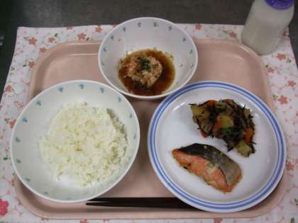 今日の給食は、ご飯・鮭のみそ漬け焼き・ひじき煮・冷ややっこ・牛乳でした。