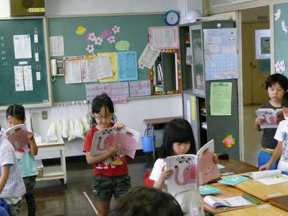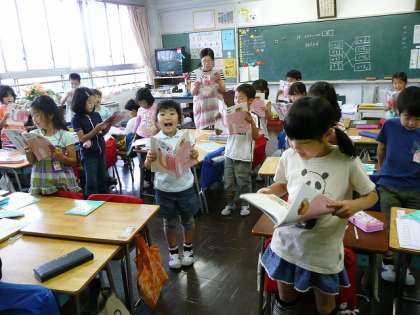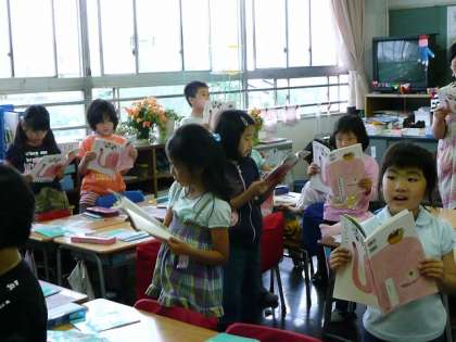 ずっと音読練習をしていた「おむすびころりん」を全員で読みました。とてもリズムよく読むことができています。