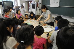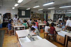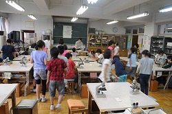 大豆のデンプンの観察をしながら顕微鏡の使い方を学んでいます。