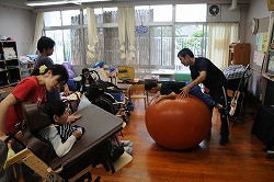 バランスボールに乗りながら、みんなと歌を歌います。
