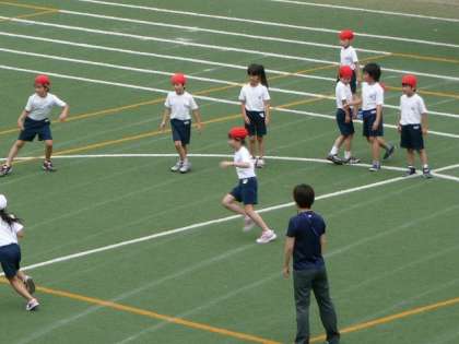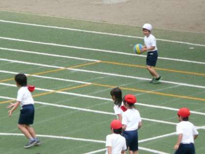 校庭でドッジボールをしています。今日は健康トレーナーの先生も指導してくださいました。