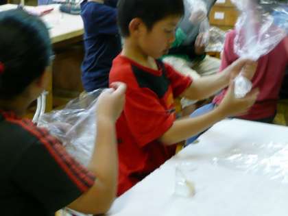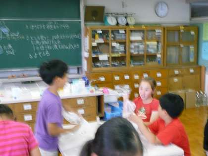 スライム作りです。異学年の友達と楽しそうに、スライムに着色もしていました。