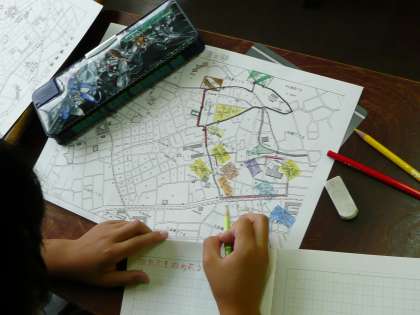東コースの町たんけんでわかったことを、地図に色分けしながらまとめています。土地の様子、自然・緑の様子、建物の様子、と分類しています。丁寧に色分けし、地図がぐっと分かりやすくなりました。