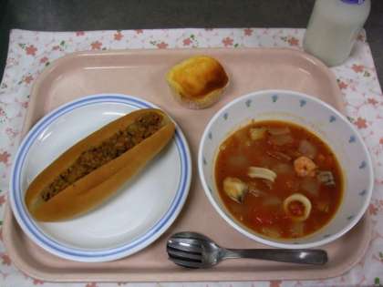 今日の給食は、ポテトミートサンド・ブイヤベース・チーズケーキ・牛乳でした。