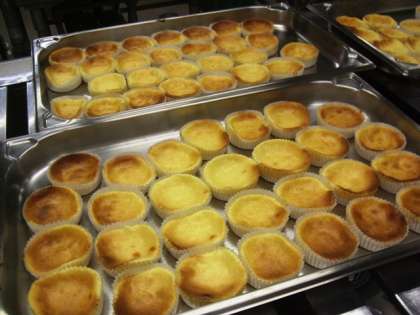 新メニューのチーズケーキは、クリームチーズに生クリームや卵、レモンを加えて焼きあげます。家庭であれば焼いてから一晩時間をおいた方が味がなじみよりおいしくなりますが、給食は当日調理師かできません。なので、朝一番に焼き、冷蔵庫で冷やすことで味をなじませました。