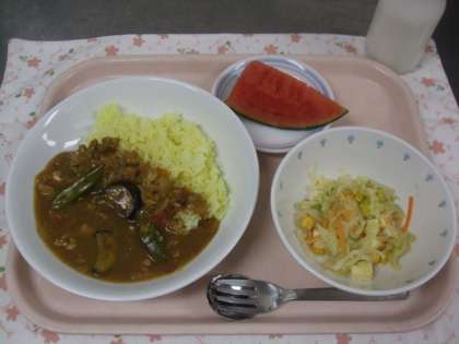 今日の給食は、米粉のトマトチキンカレー・コールスローサラダ・果物(小玉すいか)・牛乳でした。