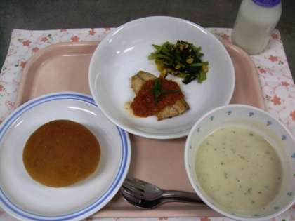 今日の給食は、ミルクパン・魚のムニエルトマトソース・青菜とコーンのソテー・白いんげん豆のポタージュ・牛乳でした。