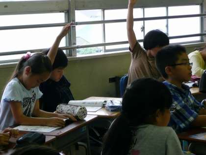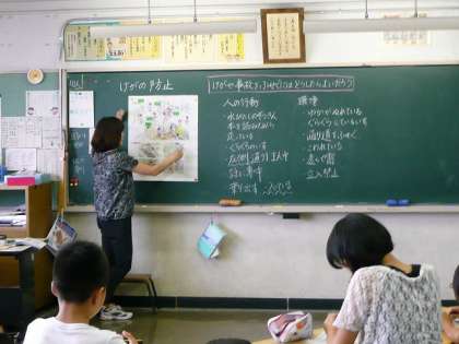 保健の学習です。けがや事故をふせぐためには、どんなことに気を付ければよいのか、絵を見ながら話し合っています。
