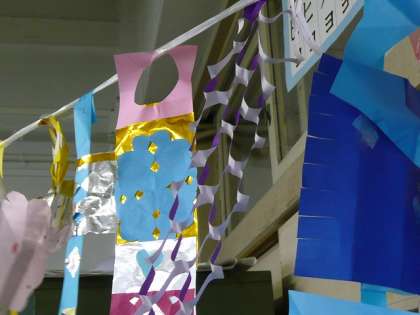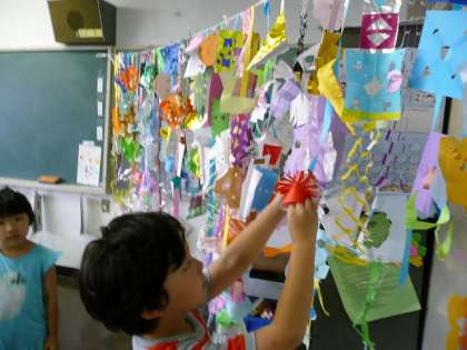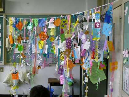 図工の時間にはさみを使って、いろいろな飾りを作りました。今、教室の入り口にたくさん、並べています。子どもたちは、「見て見て!これ、のびるんだよ」と、説明してくれます。