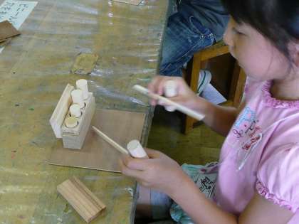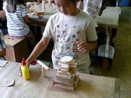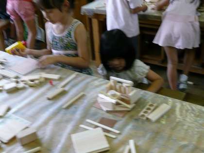 小さな木材を組み合わせて、いろいろな形を作り上げています。組み合わせていく中で、「〜にしよう」とだんだん決まってくる子、最初に「〜を作りたい!」と決めて進める子、それぞれです。