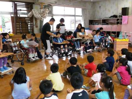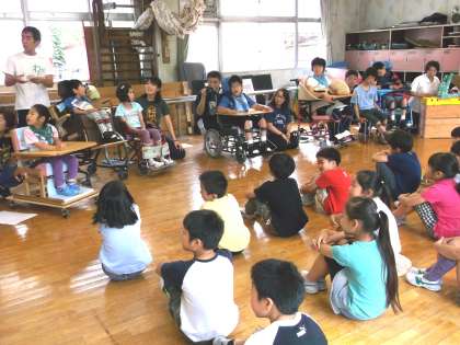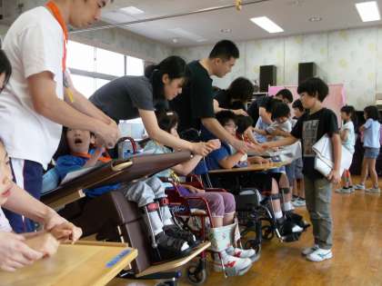 わかたけ学級の小中学生と2年2組の子どもたちとで、歌やゲームなどを楽しんでいます。