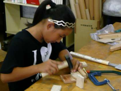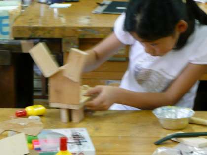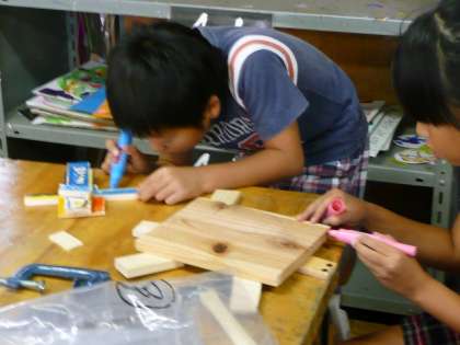 木を工夫して組み合わせ、作品を作っています。のこぎりや金づちなども頑張って使っています。
